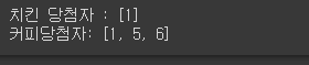 range함수를 사용하여 1~10 정수를 입력해준다음 list 타입으로 바꿔서 4명을 뽑은다음 치킨당첨자 1명을 먼저 배정하고 커피당첨자 3명을 추첨한다.