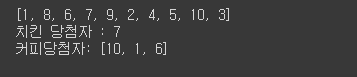 # 회원 10명중에서 치킨1명 , 커피3명 추첨하기(중복당첨불가)