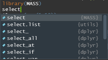 여기서 주의할점이 MASS와 DPLYR에는 각각 select함수가 있어 이런식으로 에러가 뜨는데 이때는 MASS 패키지를 detach해주면 됩니다.